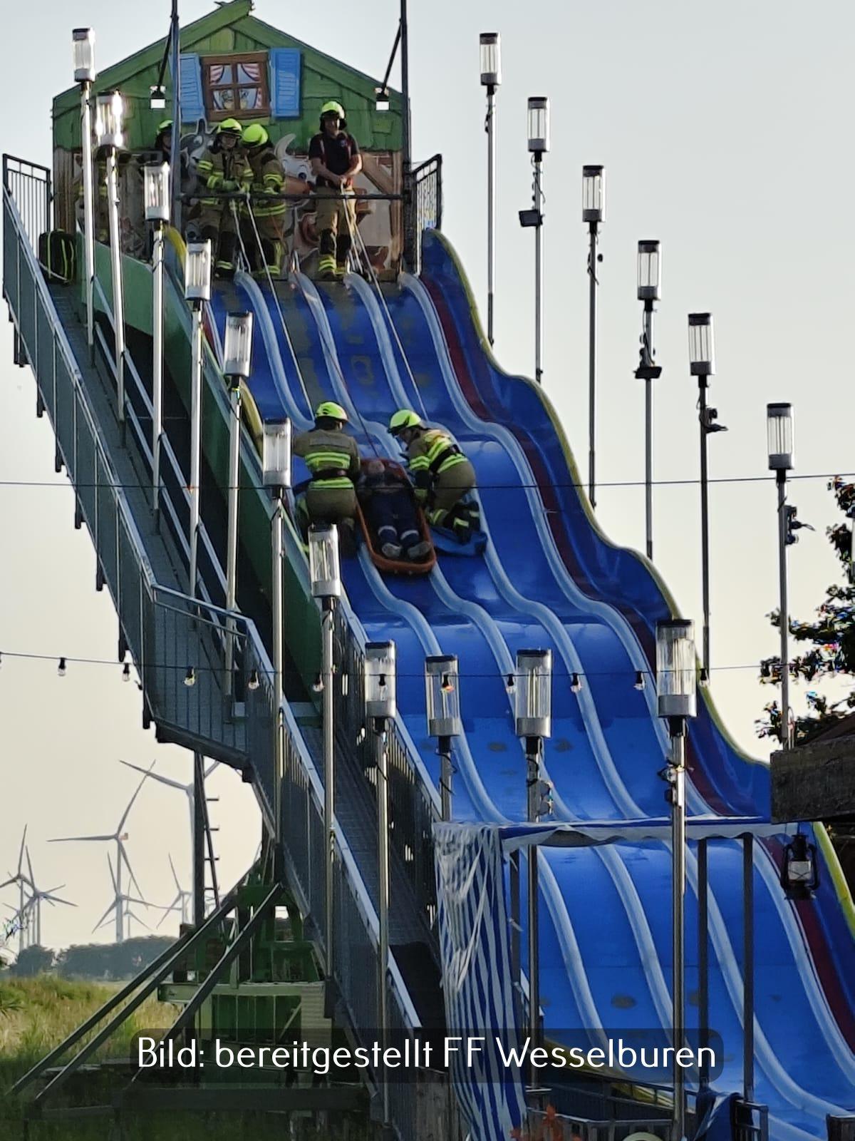 Die Besatzung vom HLF (Hilfeleistungslöschfahrzeug) musste hingegen eine Personenrettung von einer ca. 15 Meter hohen Rutsche durchführen.