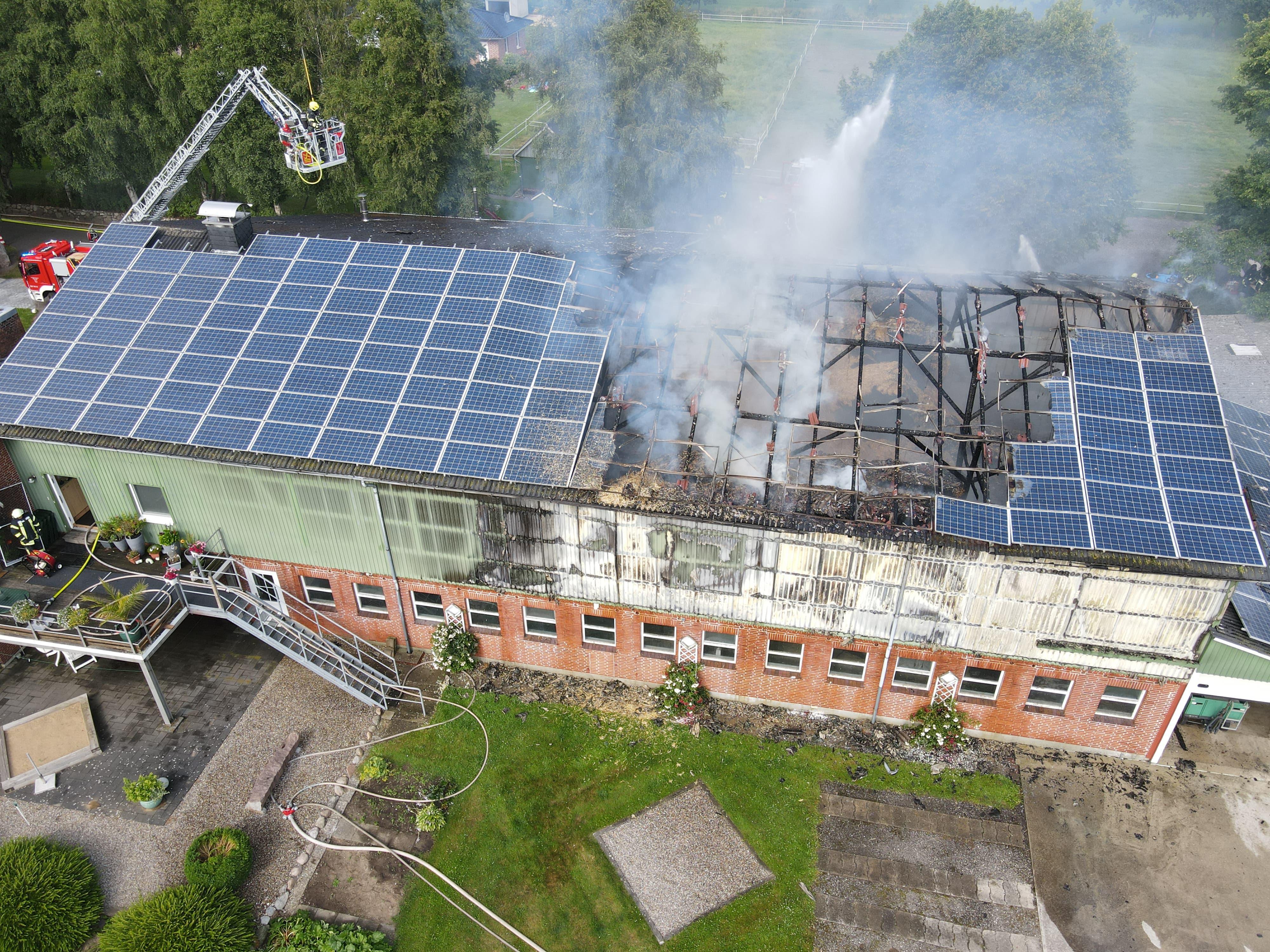 Kurz vor 16:00 Uhr ereignete sich ein Schadenfeuer auf einem landwirtschaftlichen Betrieb in Süderheistedt. Dort brannte ein Wirtschaftsgebäude im Dachbereich. Vermutlich sei durch einen technischen Defekt, an der auf dem Gebäude installierten PV-Anlage, das Feuer ausgebrochen. Schnell griff es auf einen Großteil des Gebäudes über, in dem unter Anderem Stroh und Heu gelagert wurden. Am Ende gelang es den sechs Wehren das Feuer zu bezwingen und einen Löscherfolg herbei zu führen. Für die Einsatzkräfte waren nicht zuletzt die hohen Temperaturen von über 30°C durch das Sommerwetter eine Herausforderung.