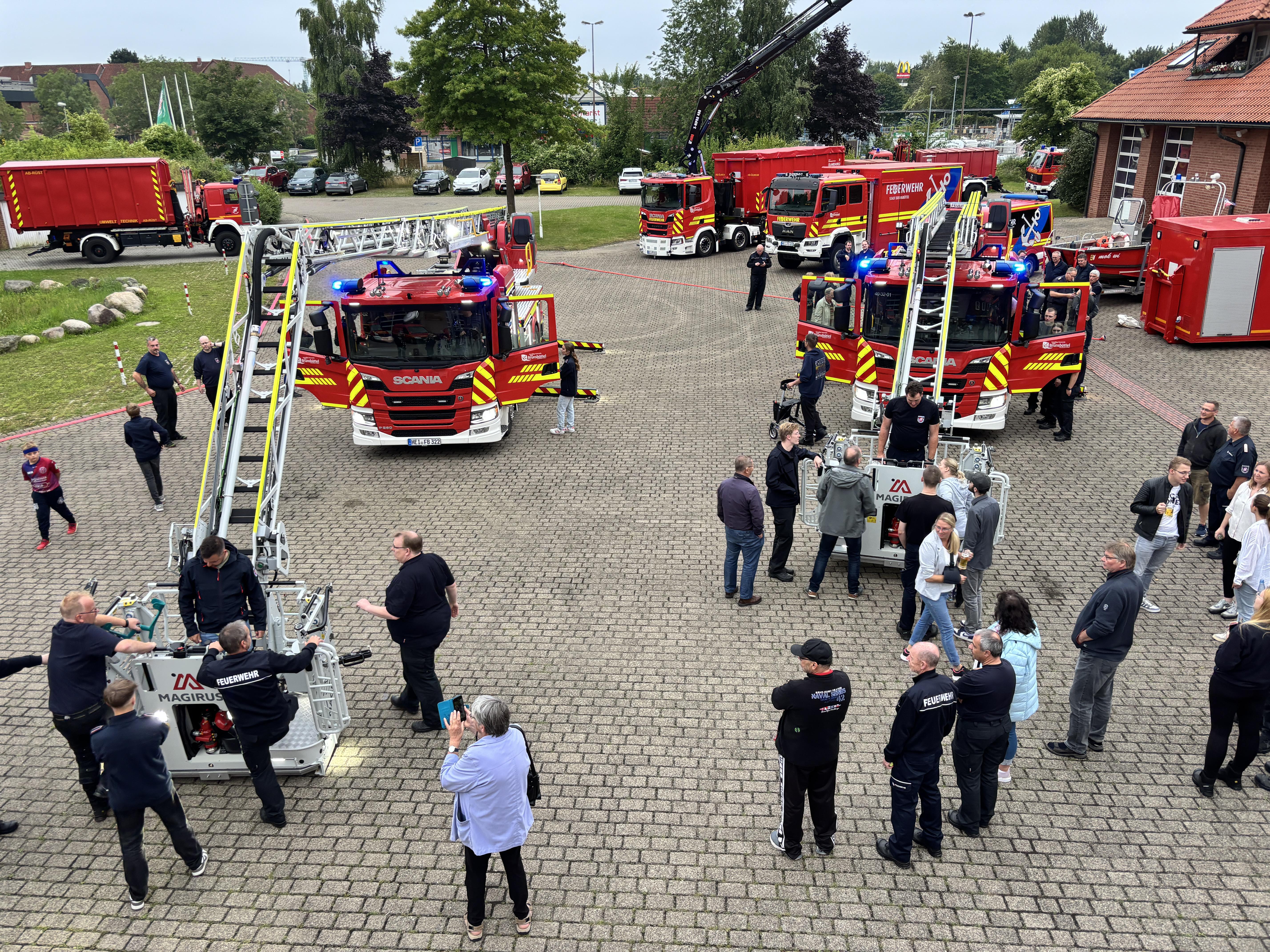 Am vergangenen Donnerstag rollten die beiden fabrikneuen Drehleitern auf Scania Fahrgestellen über den Hof der Wache Nord in Brunsbüttel. Feierlich und mit reichlich Blaulicht und Martinshorn nahmen die Brunsbütteler Brandbekämpfer die beiden neuen Fahrzeug in Empfang. Das ist auch nachvollziehbar, denn wie oft bekommt man schon als Feuerwehrmitglied die Gelegenheit, bei der Neubeschaffung eines derart besonderen Feuerwehrfahrzeuges dabei zu sein - und dann auch noch im Doppelpack.