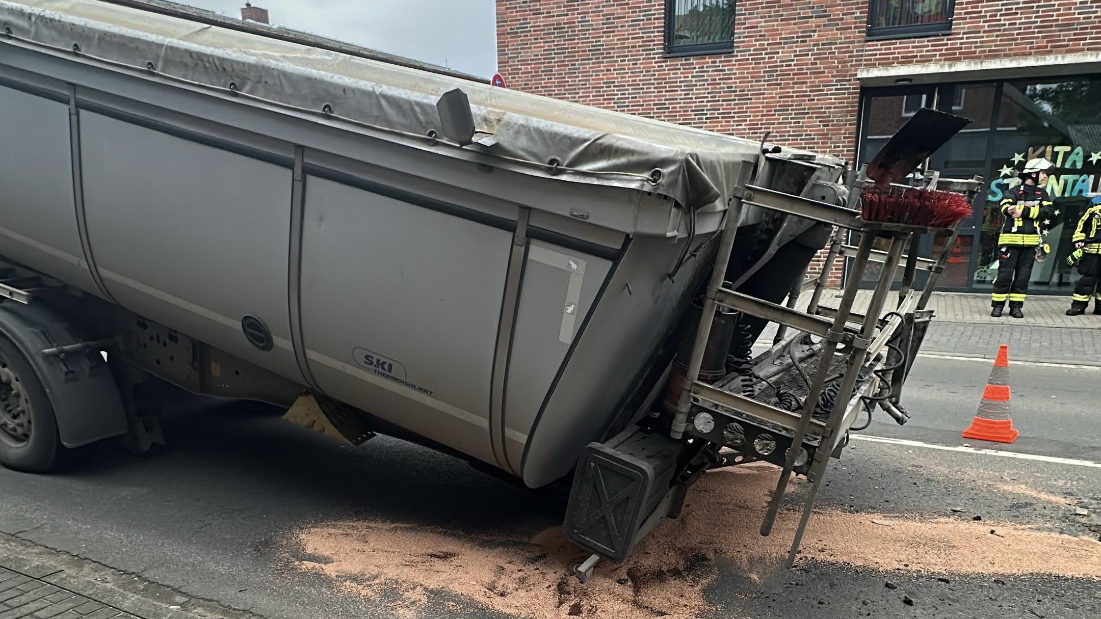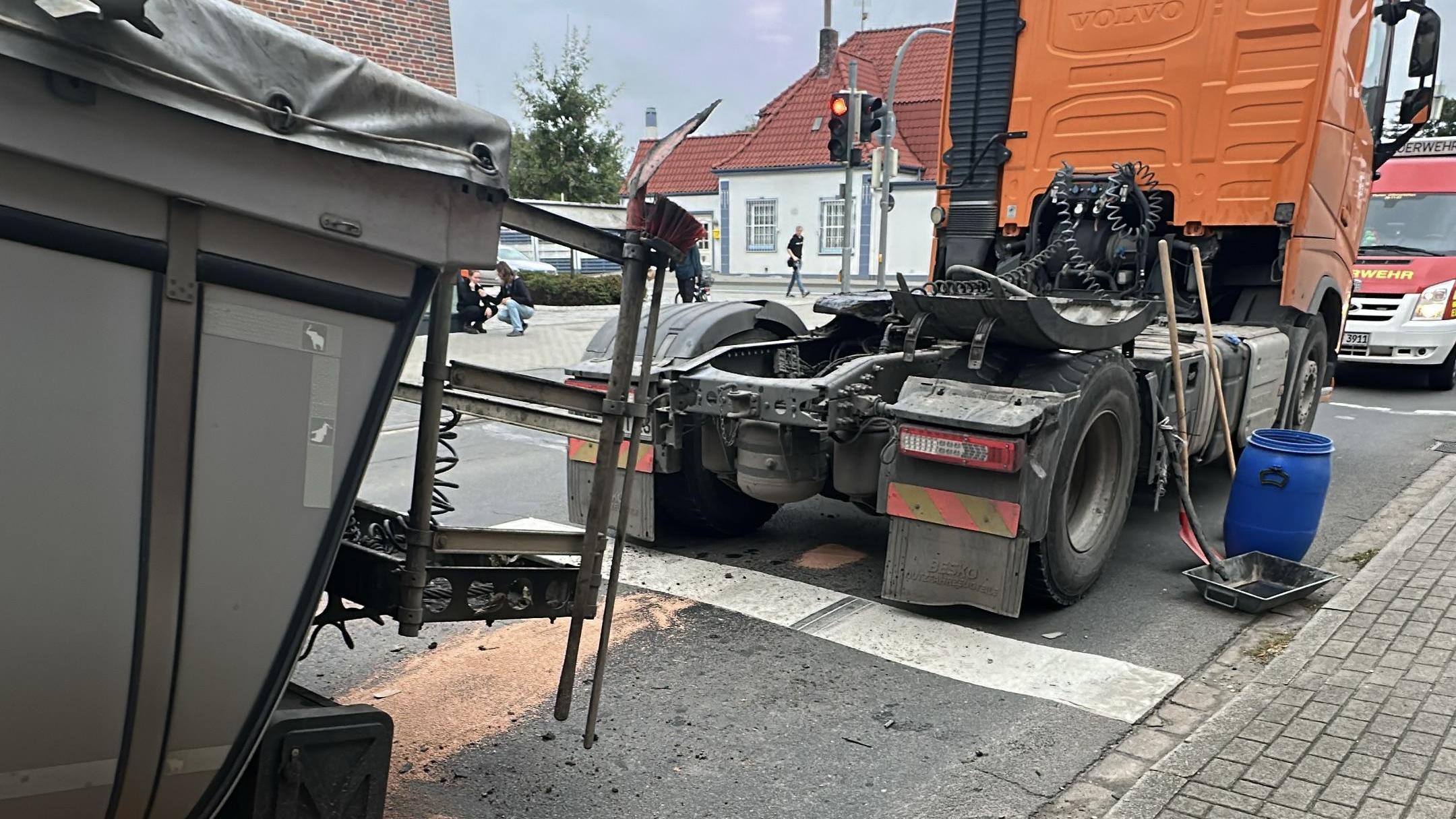 St. Michaelisdonn - Aus der Feuerwehr unbekannter Ursache hat heute Vormittag ein LKW an der Kreuzung in der Stadtmitte seinen Auflieger mit Mulde verloren. Dabei sind geringe Mengen an Betriebsstoffen ausgetreten, die von der Feuerwehr aufgenommen wurden.