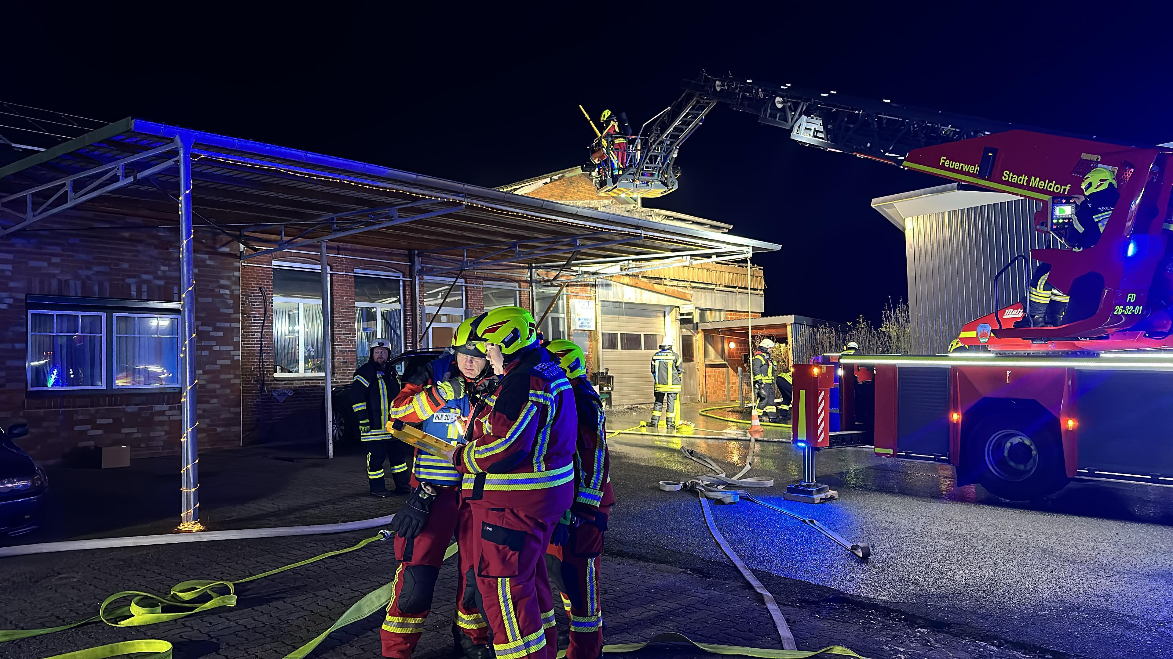 Noch während der Anfahrt wurde das Alarmstichwort zunächst auf FEU G Y und später auf FEU 3 Y erhöht. Dadurch wurden zusätzlich die Feuerwehren aus Meldorf, Nindorf, Krumstedt und Sarzbüttel nachalarmiert. Über die Drehleiter wurde die Dachhaut geöffnet und gezielt nach Glutnestern gesucht. Glücklicherweise gelang es der Feuerwehr, ein Übergreifen der Flammen auf das Gebäude sowie auf die angrenzende Werkstatt zu verhindern.
